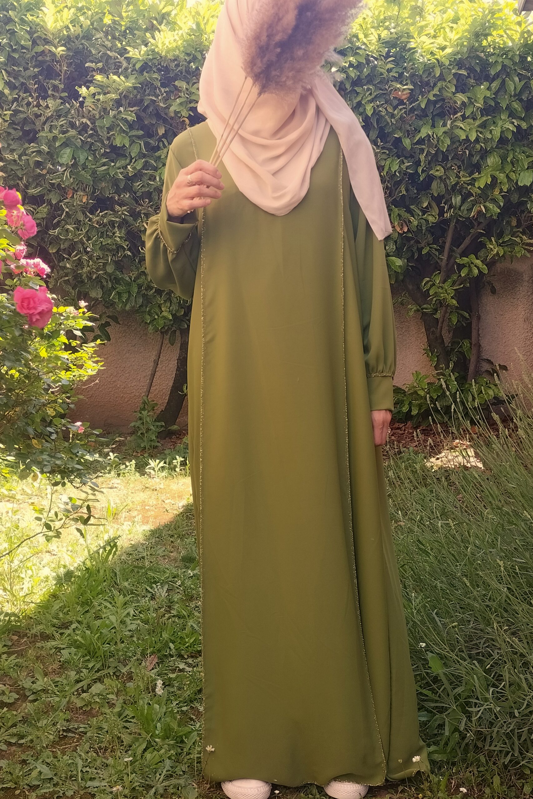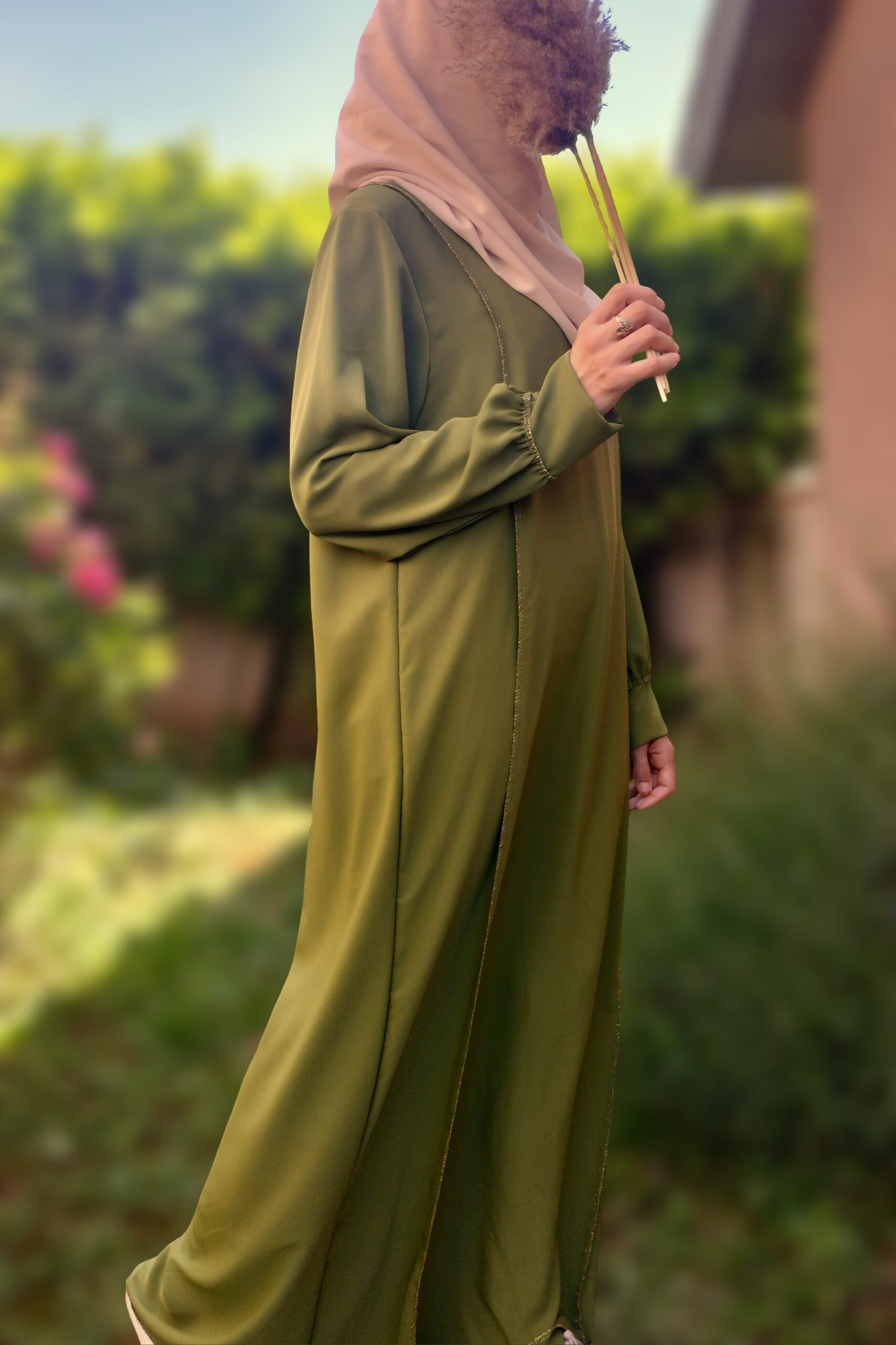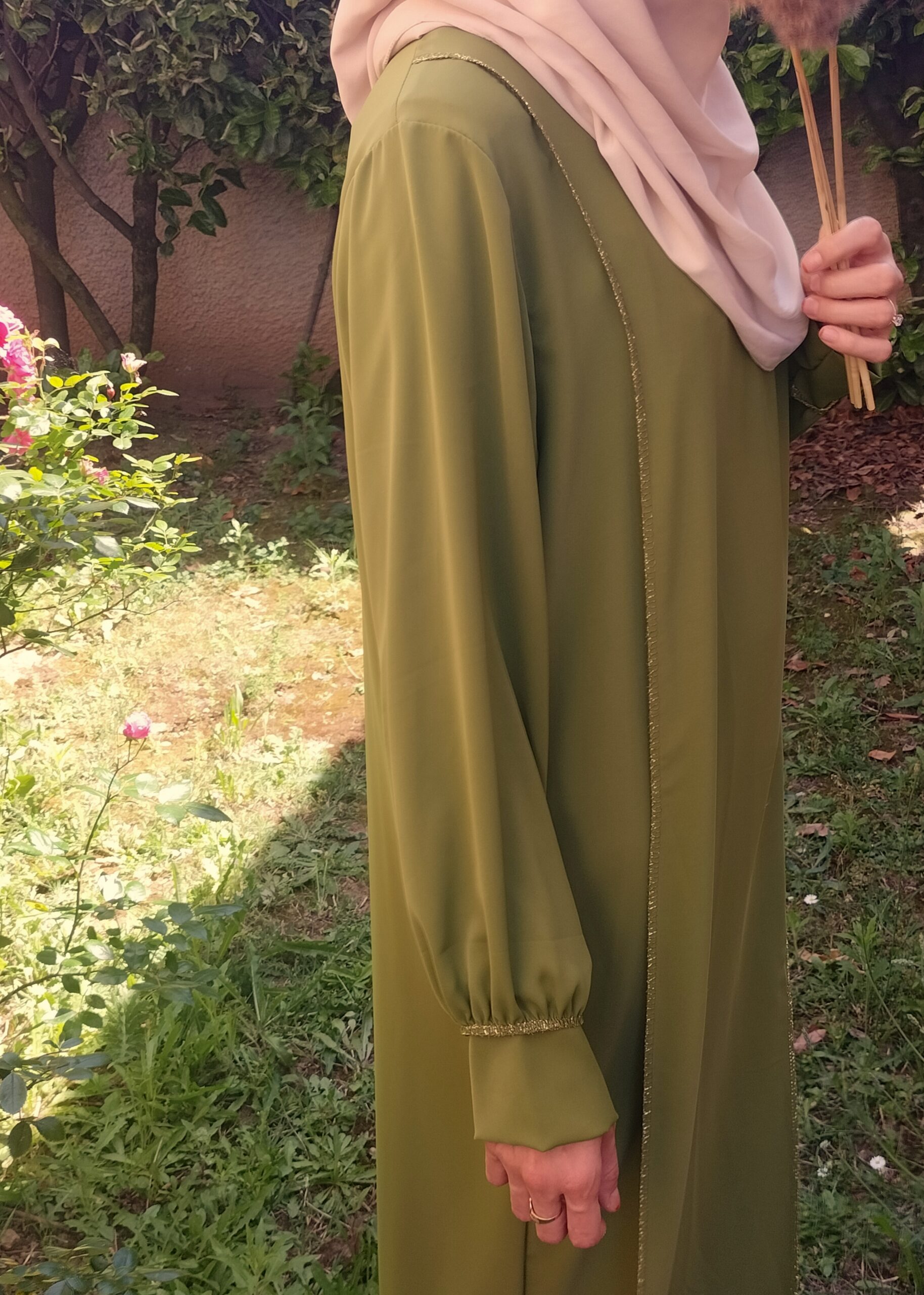 C’est une robe longue faite en soie de Médine avec de délicates coutures dorées. Elle mesure 147 cm