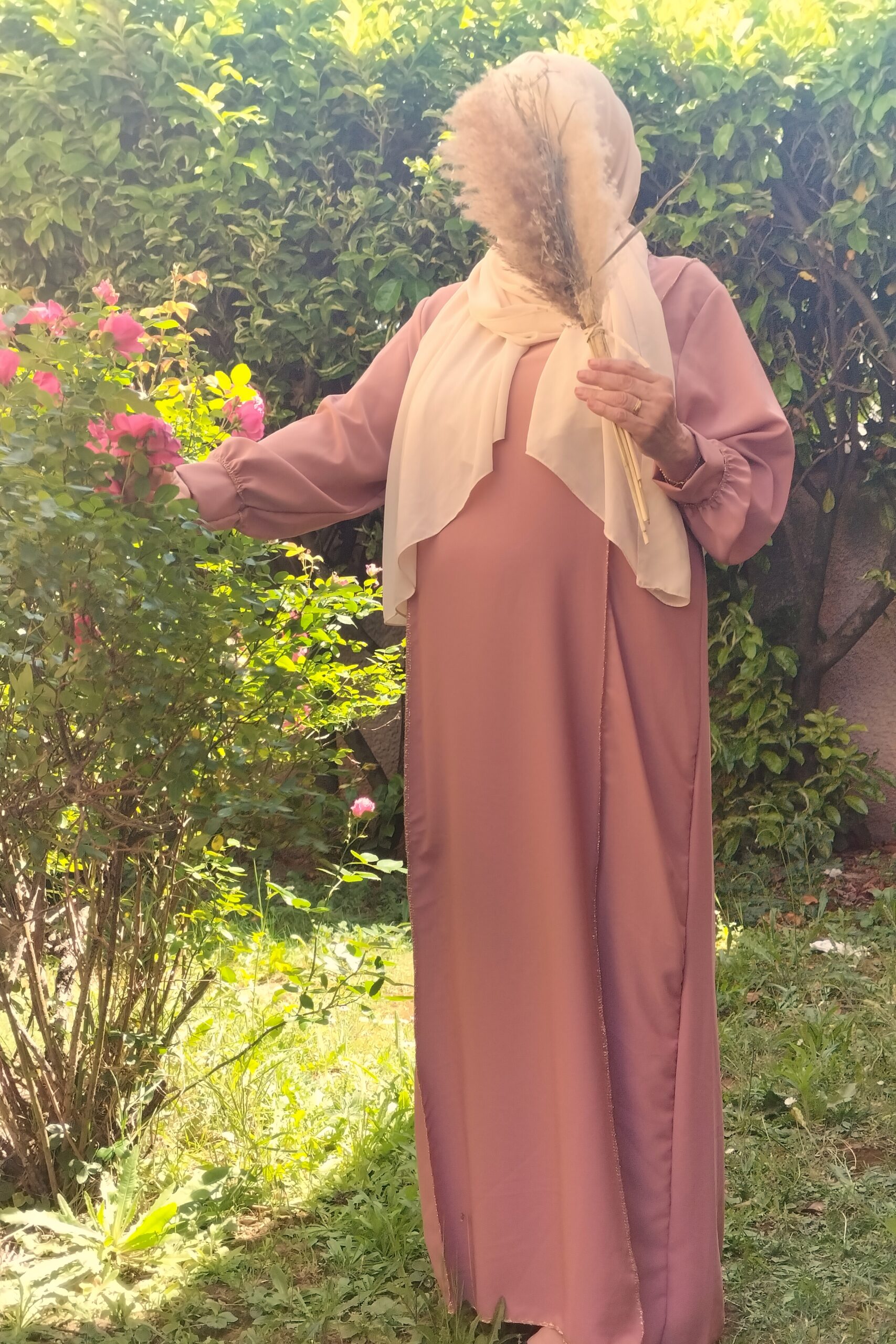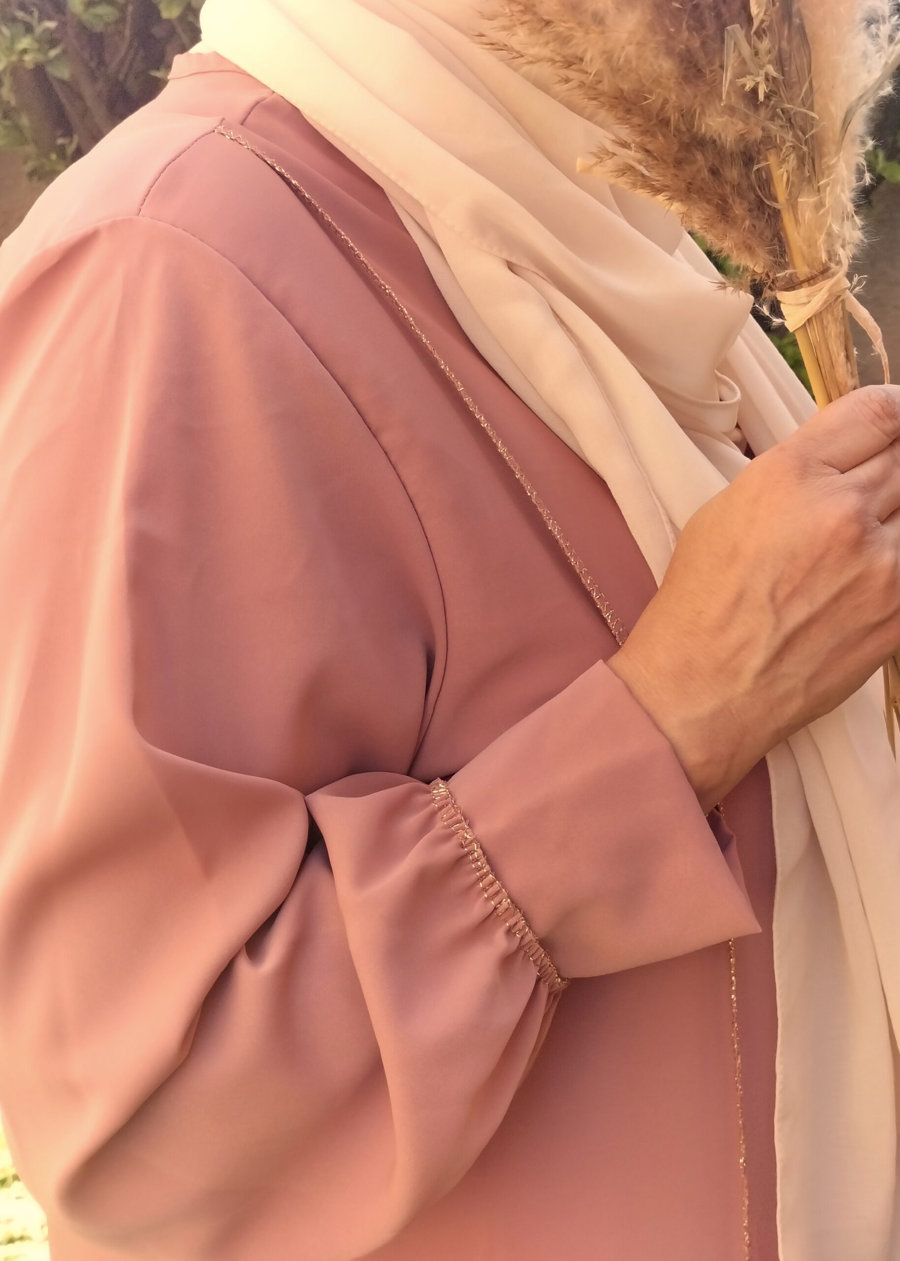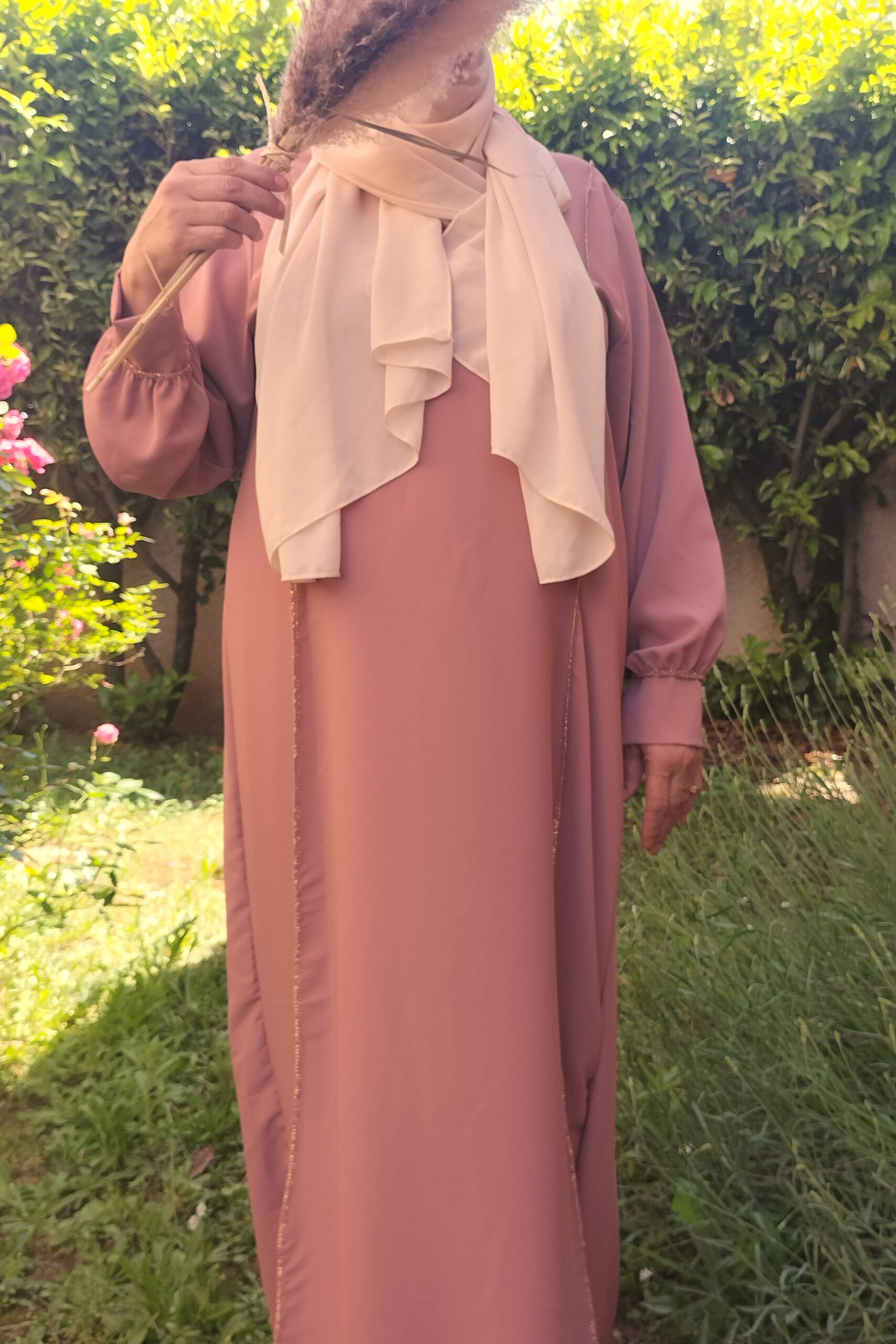 C’est une robe longue faite en soie de Médine avec de délicates coutures dorées. Elle mesure 147 cm